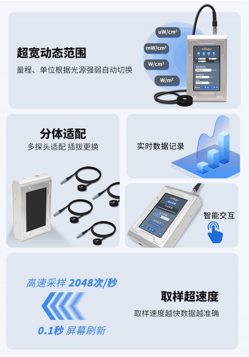 功率量程: 0.01μW/cm²-2000W/m²(根据光源强弱自动切换单位)
